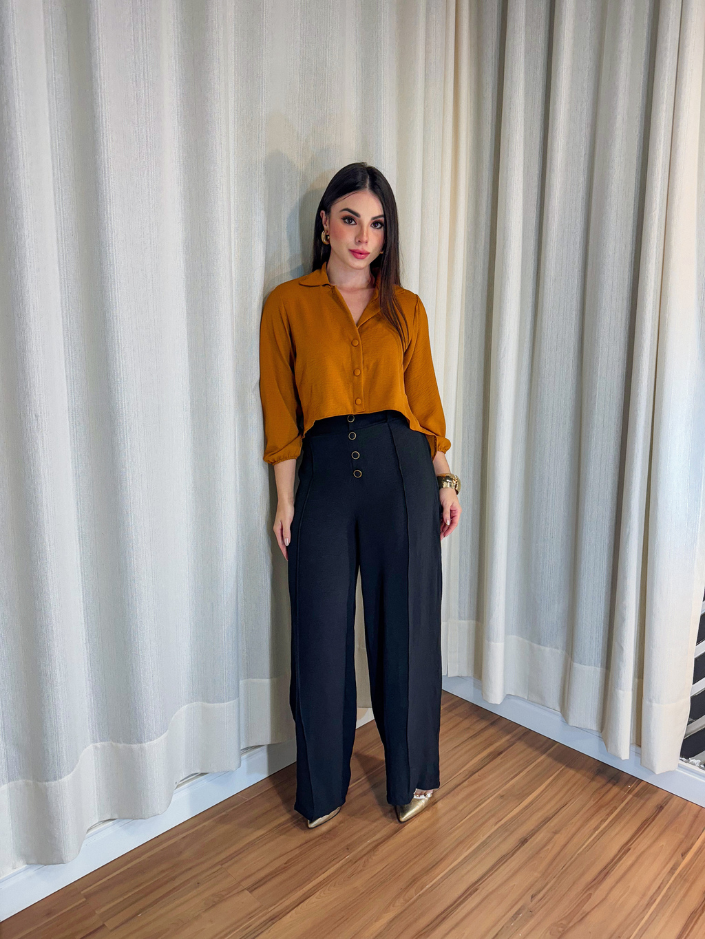 A camisa cropped preta em viscose traz leveza e elegância na medida certa. Com modelagem soltinha, botões frontais e gola clássica, ela é perfeita para composições mais refinadas sem perder o toque moderno.