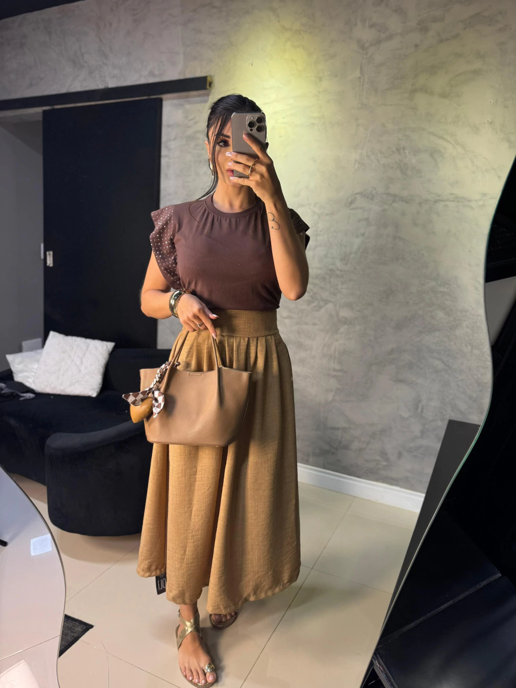 Saia Midi em Visco Linho – Confeccionada em tecido visco linho, une a leveza da viscose com a sofisticação do linho, garantindo caimento impecável e muito conforto. O modelo midi traz cintura marcada e volume sutil, proporcionando movimento e um visual refinado.